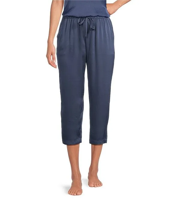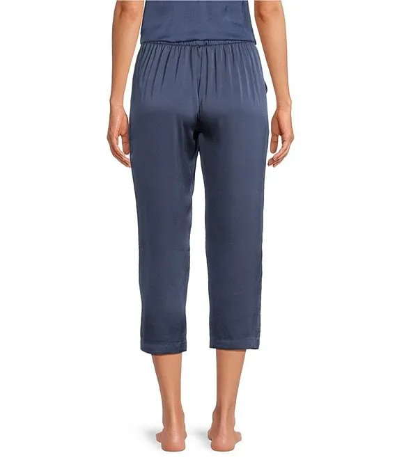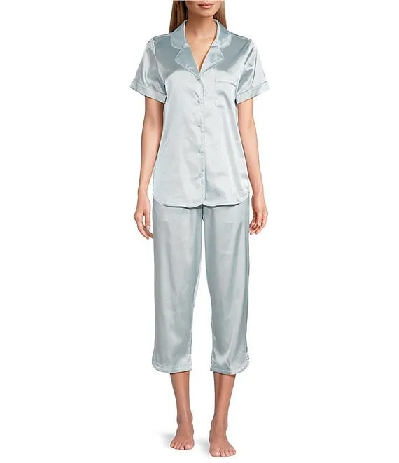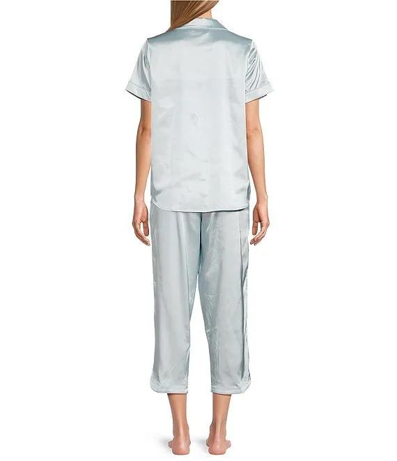 Woven Solid Blue Satin Short Sleeve Capri Pajama Set