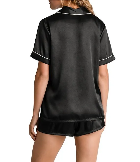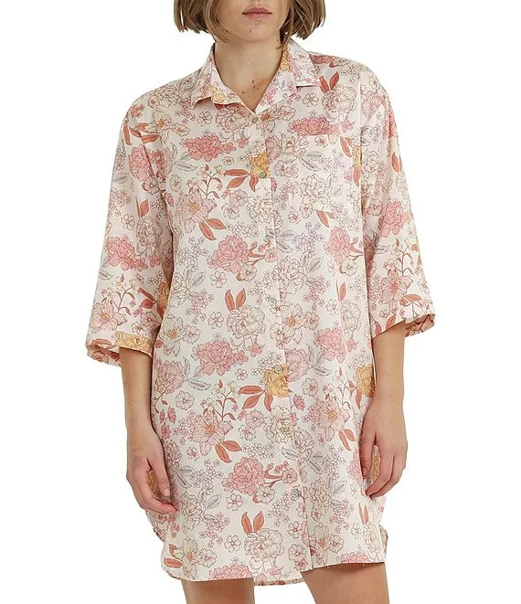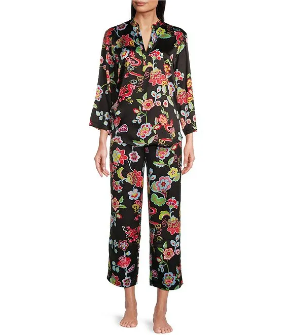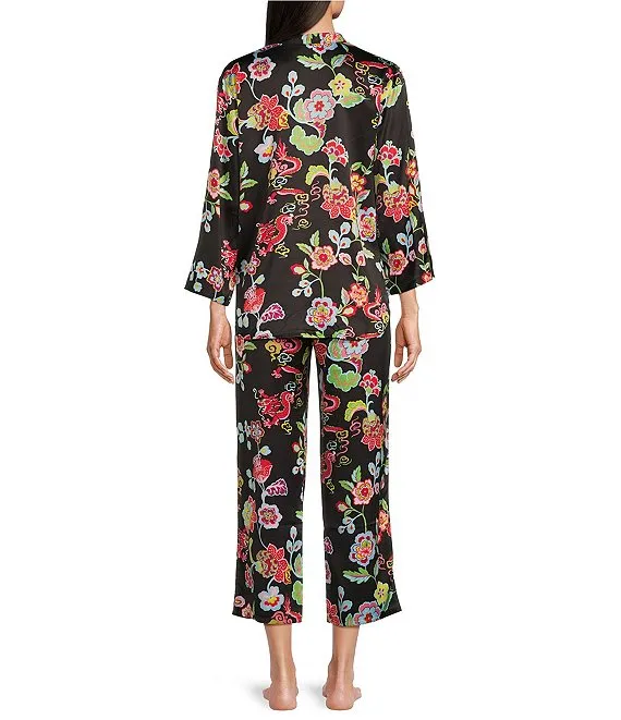 N by Natori Dragon Floral Satin 3/4 Sleeve Split V-Neck Coordinating Pajama Set