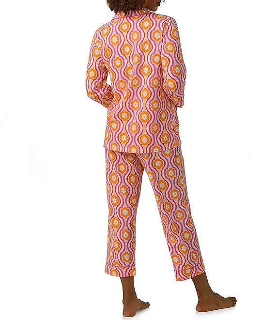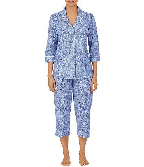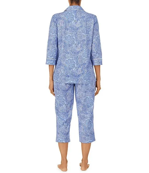 Lauren Ralph Lauren Paisley Print Jersey Knit 3/4 Sleeve Notch Collar Cropped Pajama Set