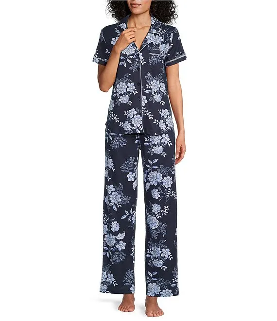 Short Sleeve Notch Collar Graphic Blooms Interlock Knit Pajama Set