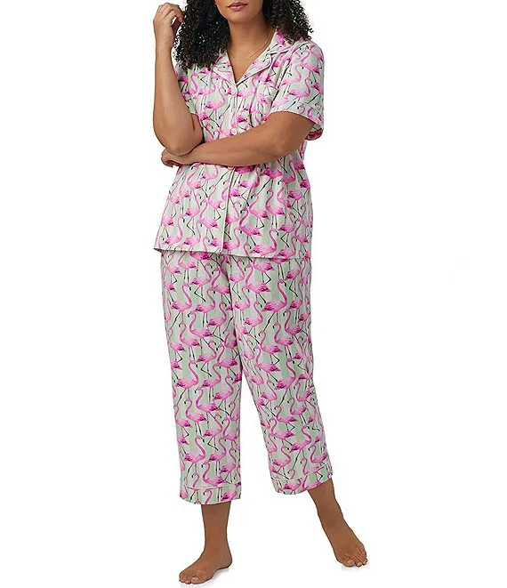 Plus Size Short Sleeve Notch Collar Jersey Knit Flamingo Print Cropped Pajama Set