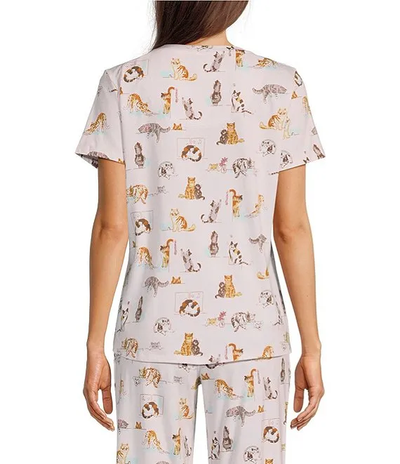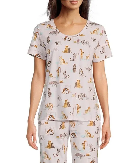 Lounging Cats Print Short Sleeve Scoop Neck Coordinating Knit Sleep Top
