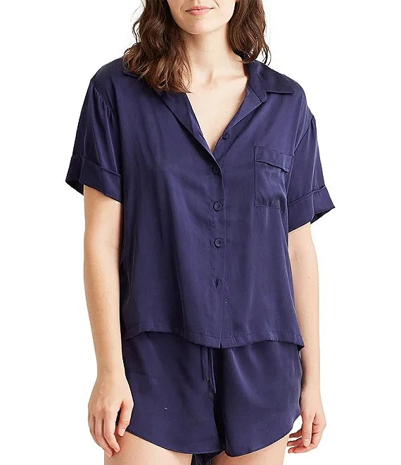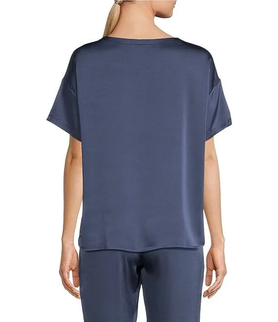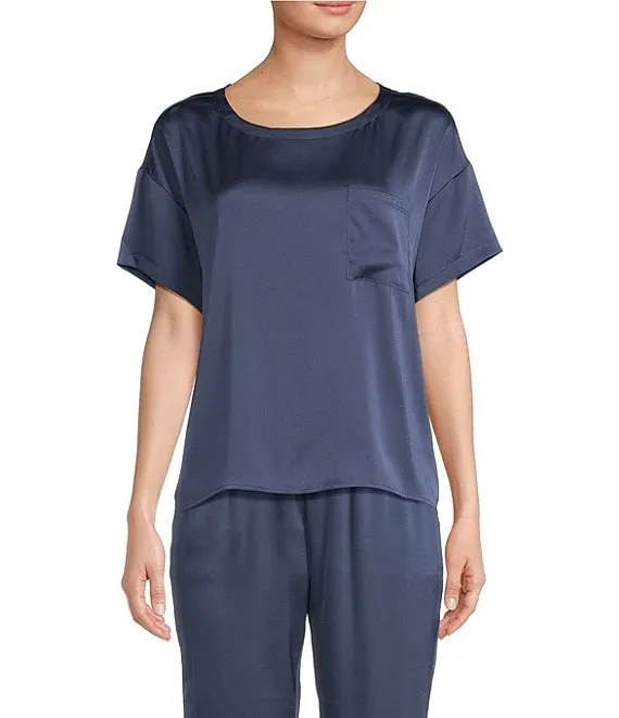 VAN WINKLE & CO. Solid Woven Satin Short Sleeve Scoop Neck Drop Shoulder Chest Pocket Coordinating Sleep Top