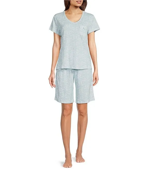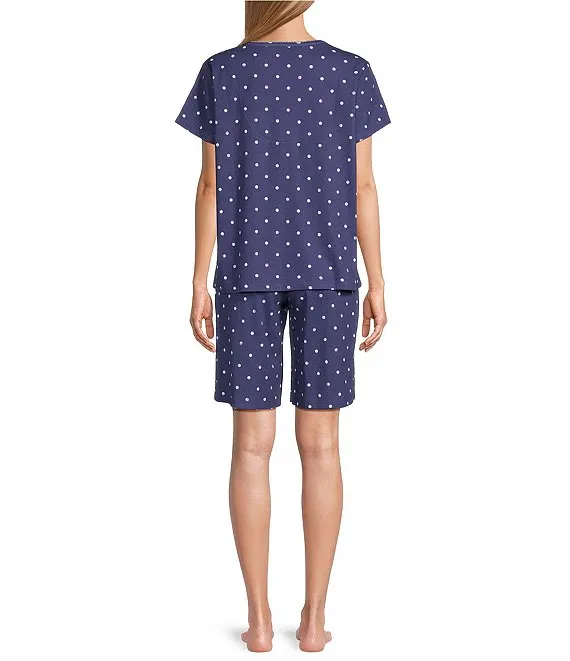 Short Sleeve V-Neck Brushed Interlock Knit Bouquet Dot Print Bermuda Short Pajama Set