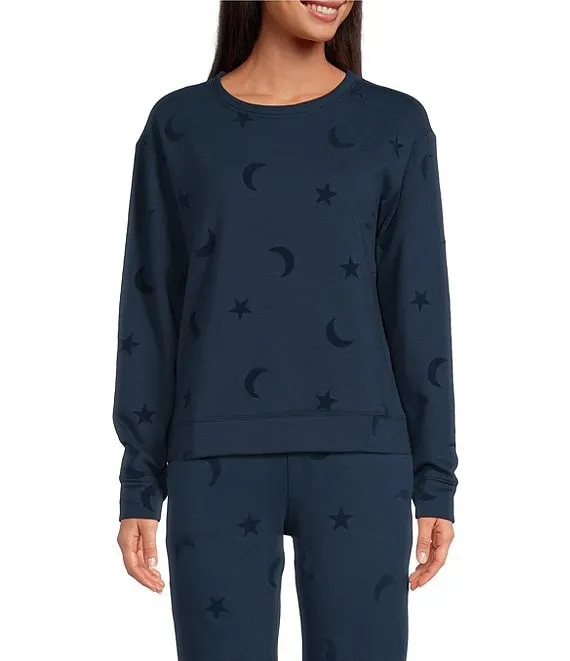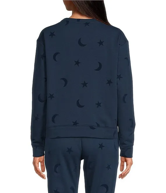 Moon & Stars Flocked Printed Long Sleeve Crew Neck Coordinating Sleep Top
