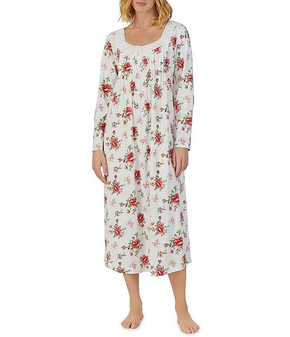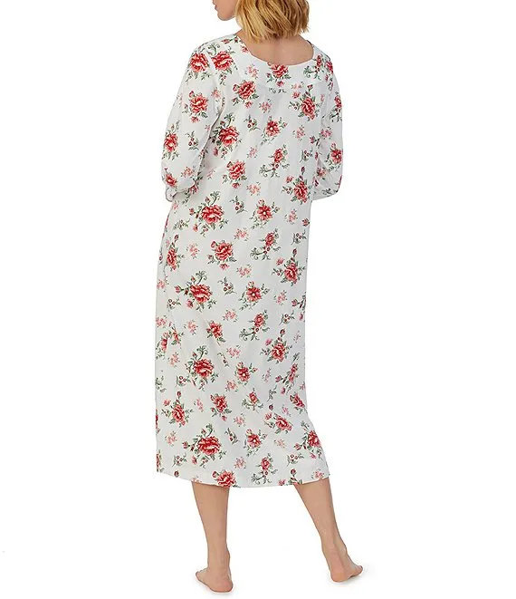 Long Sleeve Floral Print Jersey Knit Long Nightgown