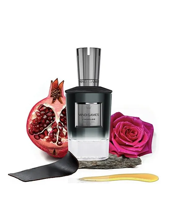 - J'Adoube: opening of pomegranate, rouge groseille, and mandarin, as the fragrance surges forward in a wave of tantalizing sweetness followed by its evolution towards a bold and deep base of leather, patchouli, and ambrostar