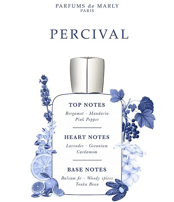 Presenting a subtle balance of citrus and aromatic notes on a woody base, this Eau de Parfum exudes a fresh, sensual and refined scent in an ocean blue bottle that will be remembered. Amongst the top notes, scents of bergamot and mandarin sublimate through a touch of aromatic water to offer a unique combination. The heart notes give Percival its character and depth through a blend of natural jasmine, violet and geranium, overlapping with lavender, coriander and cinnamon. On the skin, musk mixes with pepper, absolute balsam fir and, to give emphasis, woody spices are revealed at the base.