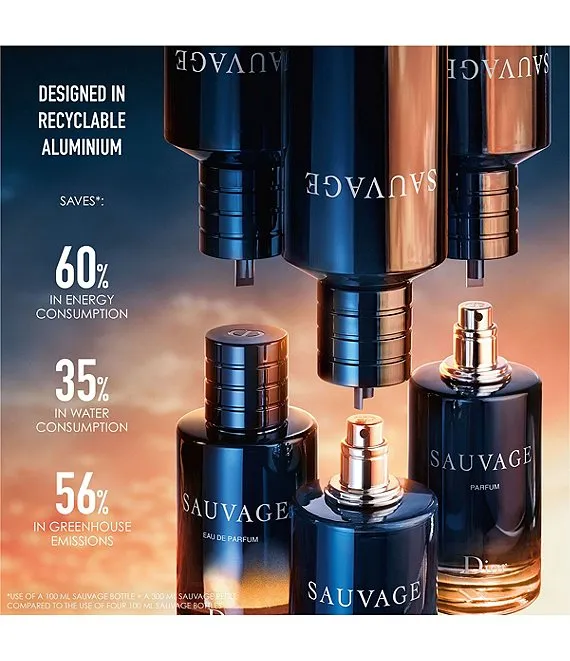 The Sauvage refill bottle is in keeping with the vision for more responsible luxury that respects natural resources. Recyclable, its simplified aluminum design allows environmental impact to be reduced by consuming 60% less energy, 35% less water, and producing 56% less greenhouse gas.*