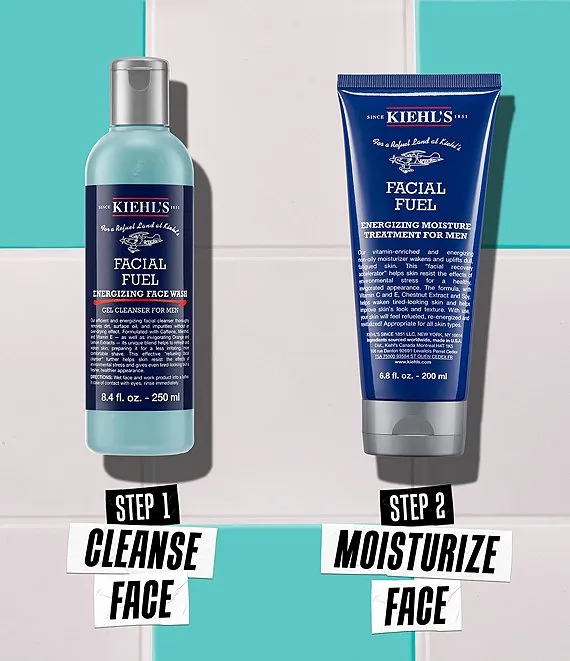 - Facial Fuel Cleanser: Wet face and work Kiehl's face wash for men into a lather. Massage onto skin in an upward and outward motion, avoiding the immediate eye area. Rinse thoroughly. Can be used morning and night.