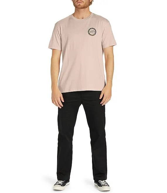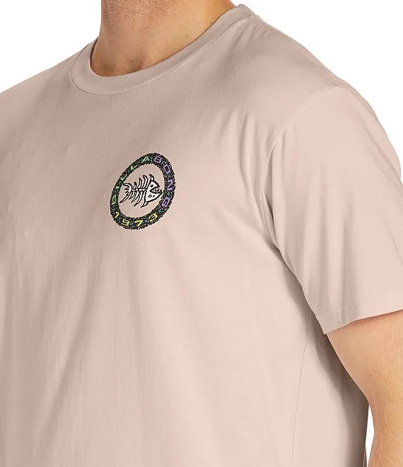 - circle-shaped soft-hand screenprint with center fish bones graphic, Billabong logo and other verbiage on the front and back