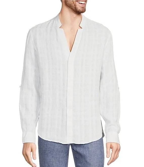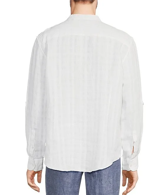 Baird McNutt Linen Mandarin Collar Textured Roll-Tab Sleeve Shirt