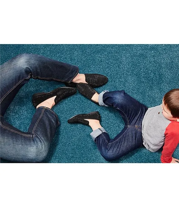 - Slip on fashion loafer with crystal embellishments for extra pop and flare