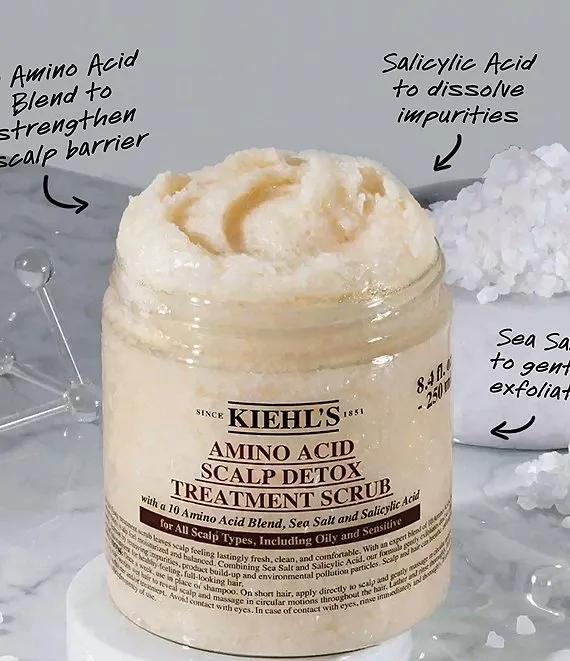 Gently exfoliate and purify your scalp with Kiehl's refreshing scalp scrub with a blend of 10 Amino Acids, Salicylic Acid and Sea Salt. This rebalancing scalp exfoliating scrub helps to create lasting scalp comfort that cleanses away excess oil and sebum buildup from environmental aggressors without over drying the skin. Use this scalp exfoliating scrub to detoxify the scalp for a clean and fresh feeling scalp.
