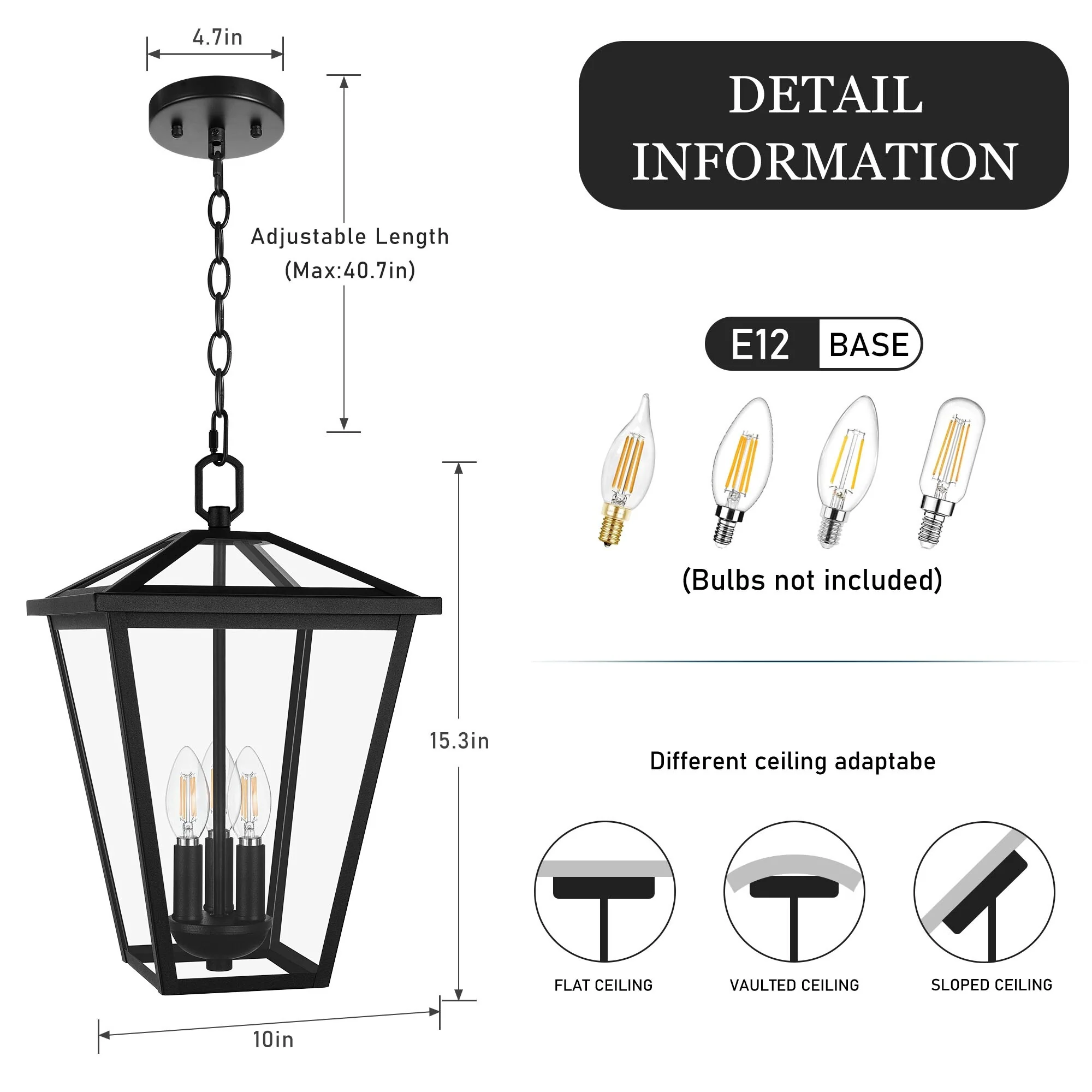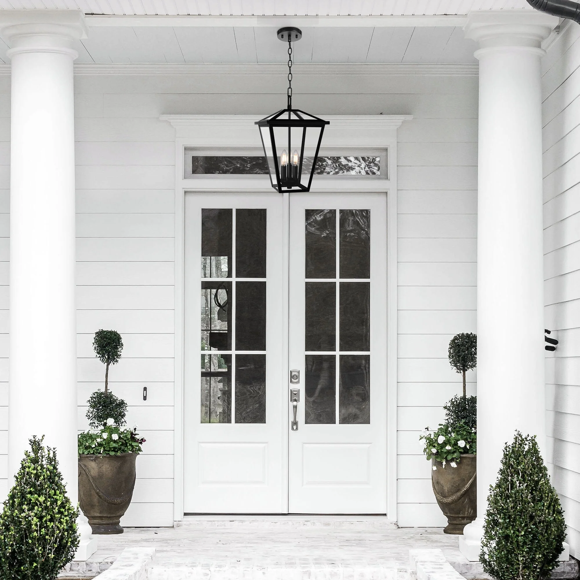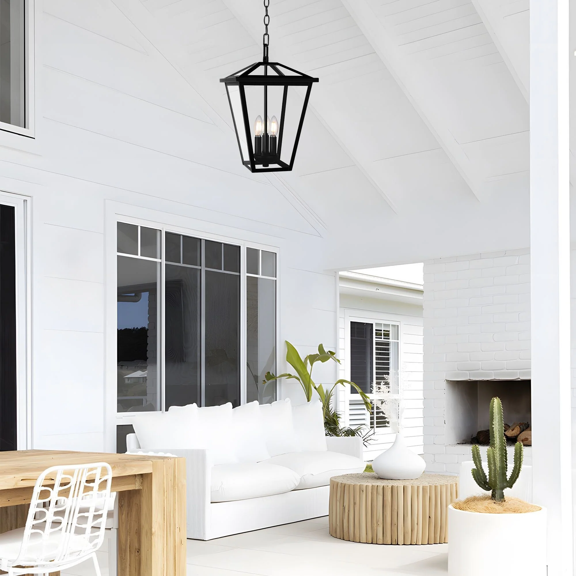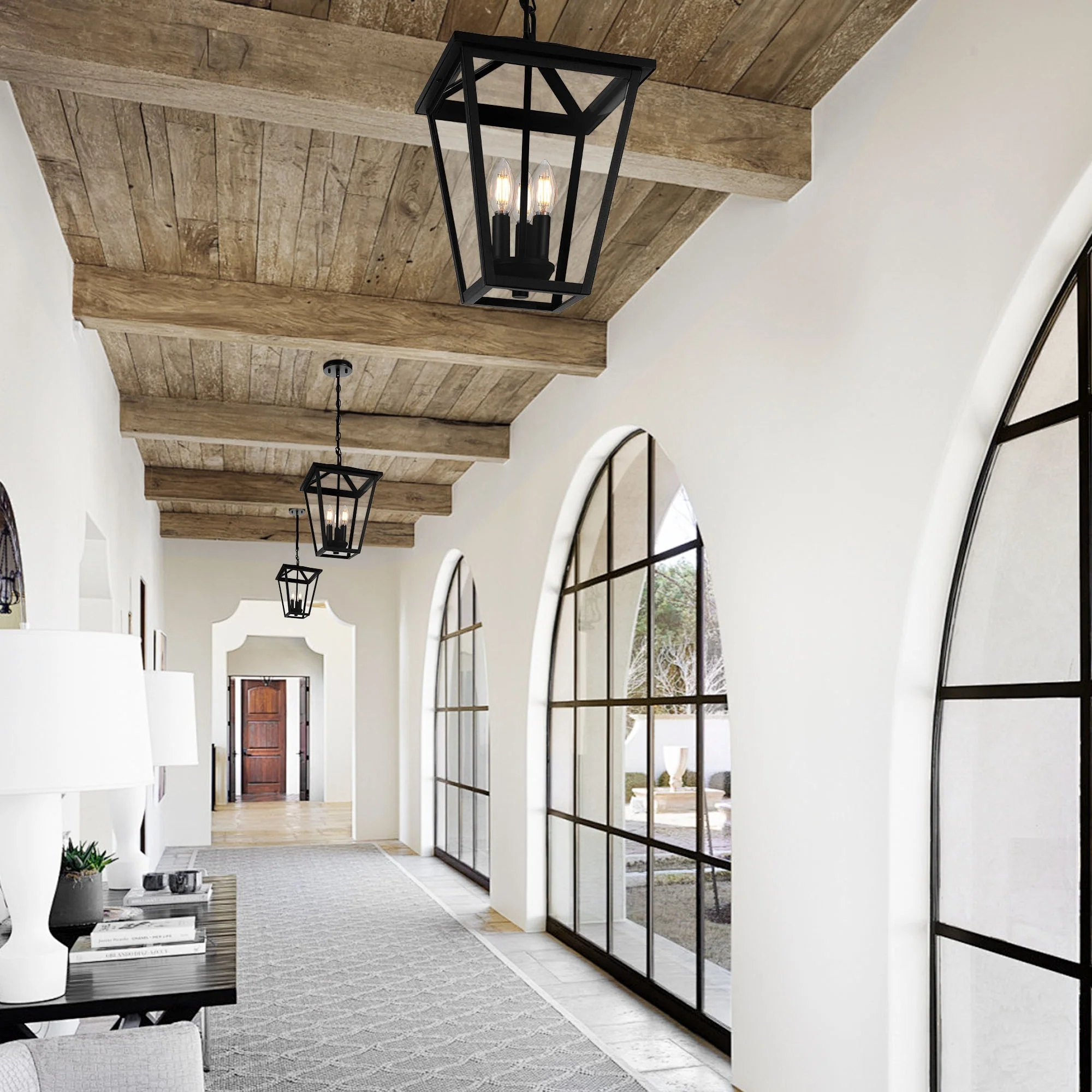 3-Light Black Outdoor Hanging Light Fixture with Clear Beveled Glass