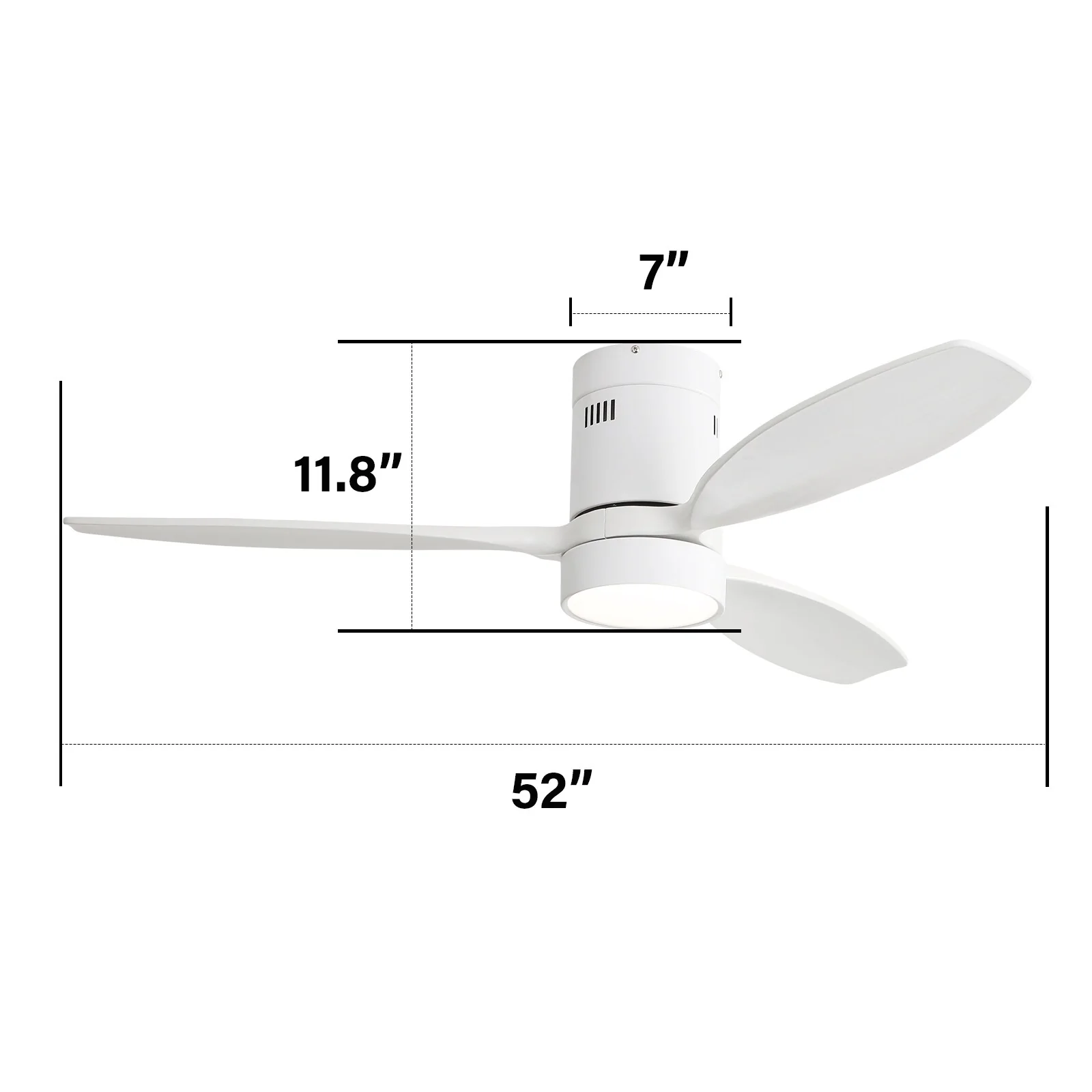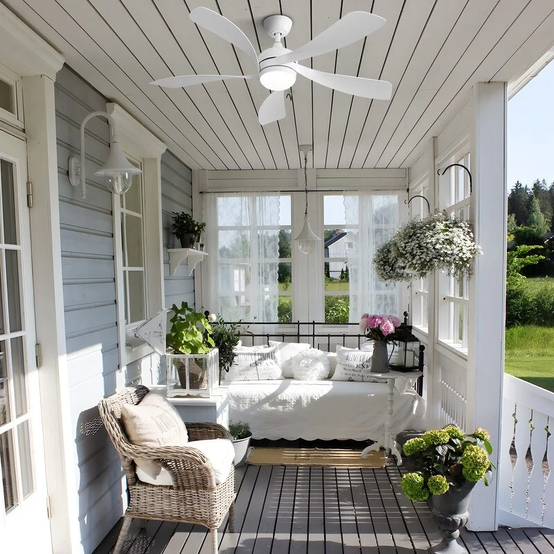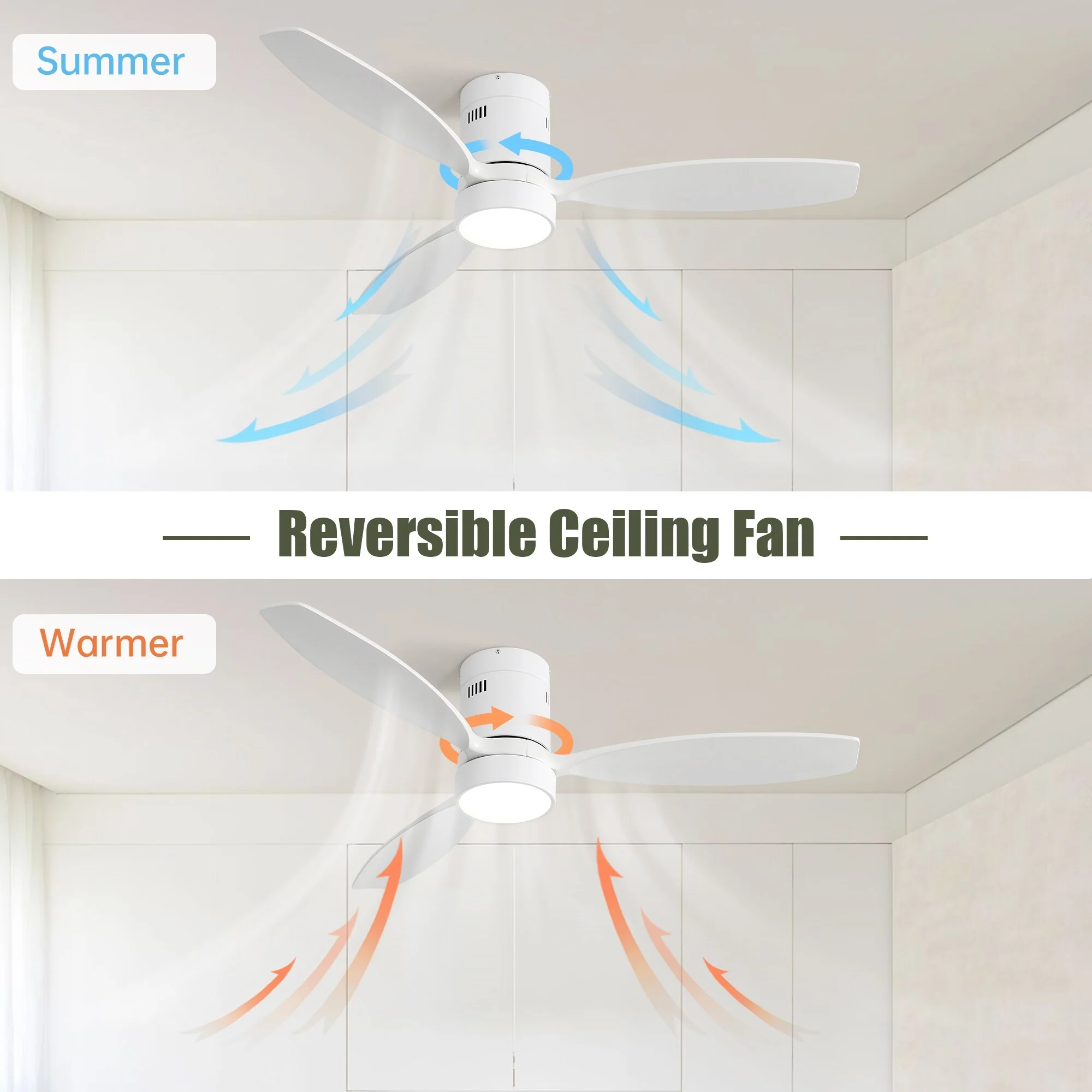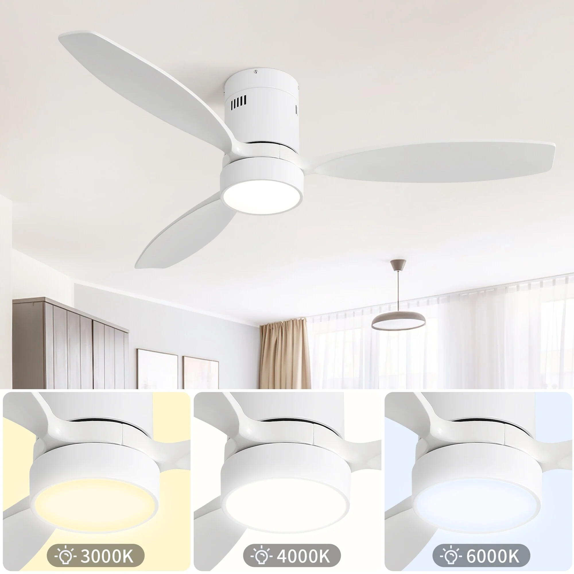 Indoor Outdoor Wood Ceiling Fan Light, 52 Inch Flush Mount Ceiling Fan, Noiseless Reversible Motor, White