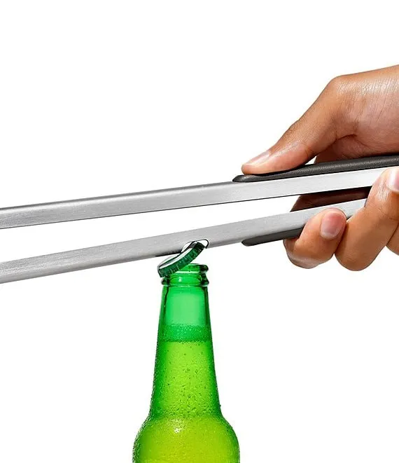 - Tongs feature a non-slip grip and a built-in bottle opener