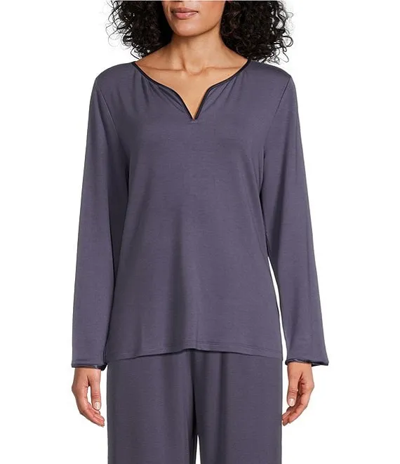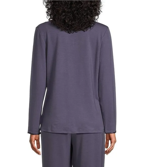 French Terry Satin Trimmed Long Sleeve Split Round Neck Coordinating Sleep Shirt