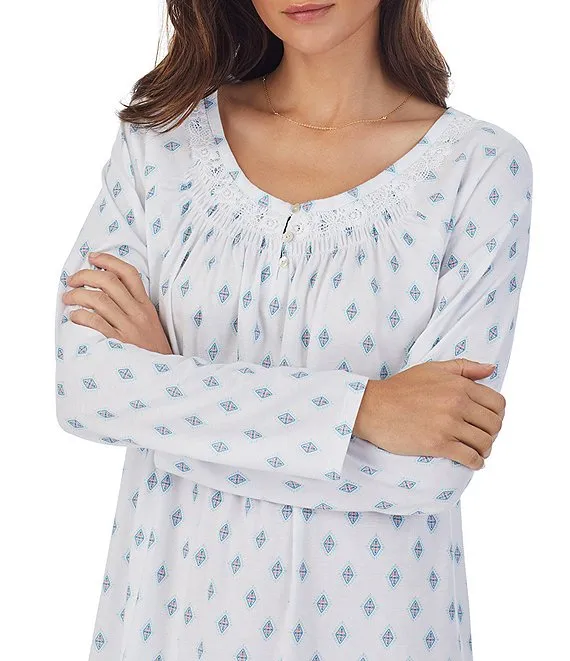 Knit Diamond Print Long Sleeve Round Neck Short Nightgown