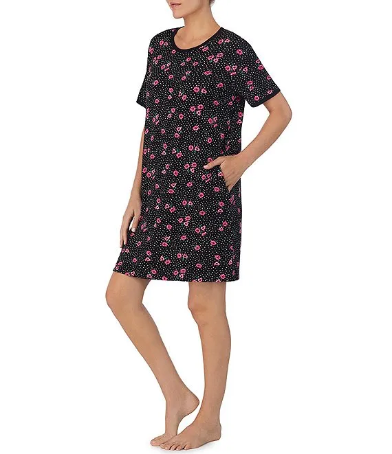 Short Sleeve Round Neck Knit Floral Dotted Sleepshirt