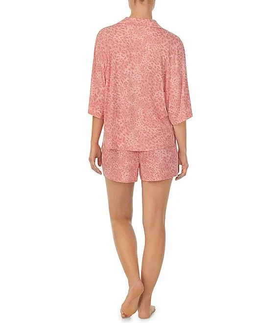 Knit Leopard Print Notch Collar Button Front 3/4 Sleeve Elastic Waist Short Pajama Set