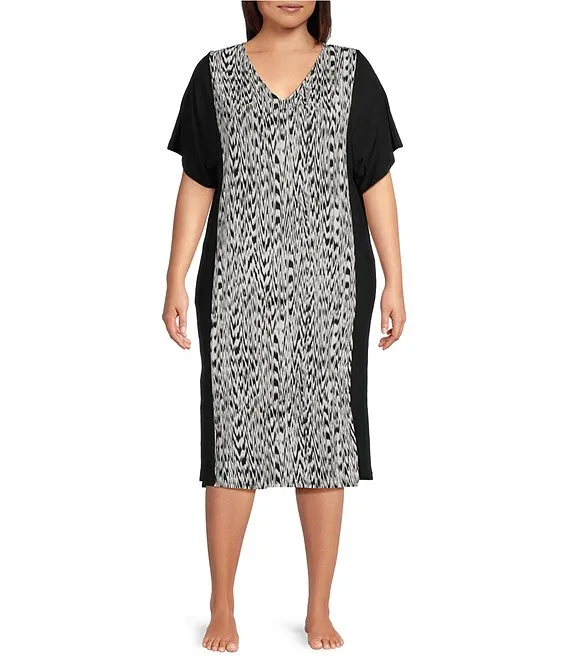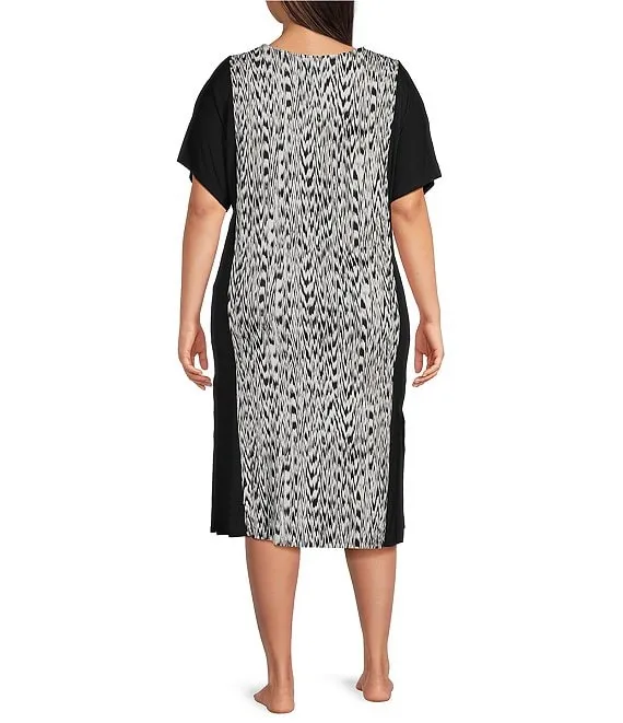 Plus Size Knit Textured Ikat Print Short Sleeve V-Neck Nightshirt