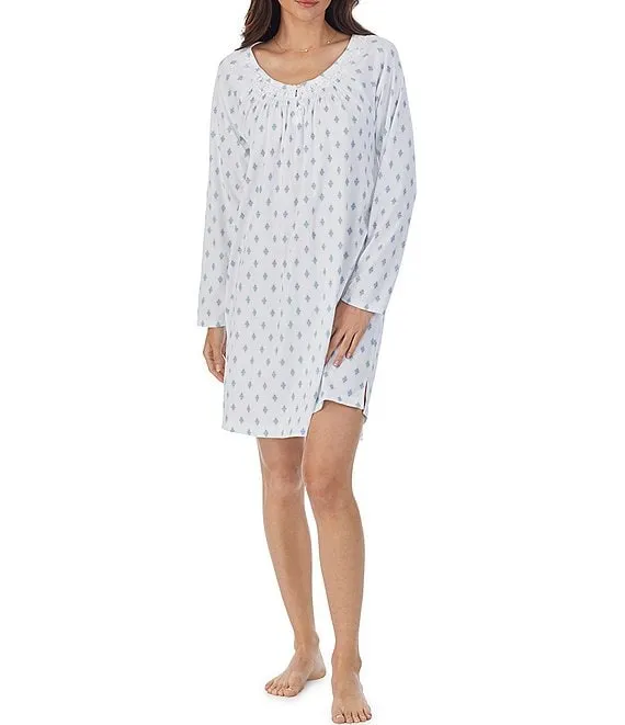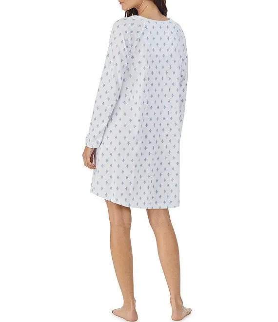 Knit Diamond Print Long Sleeve Round Neck Short Nightgown
