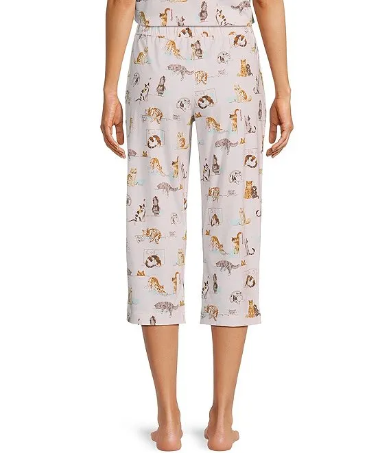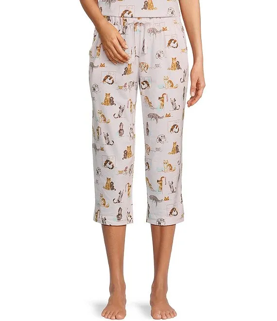 Lounging Cats Print Knit Drawstring Tie Coordinating Sleep Pant