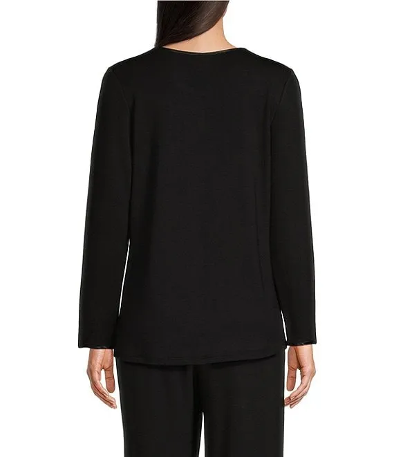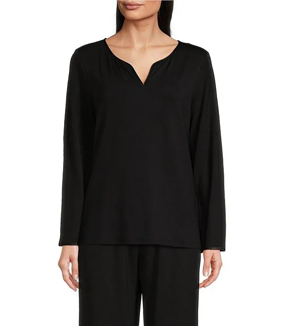 French Terry Satin Trimmed Long Sleeve Split Round Neck Coordinating Sleep Shirt