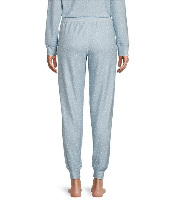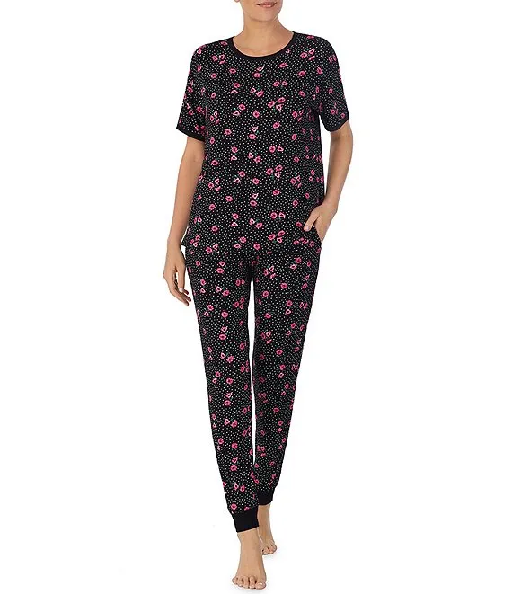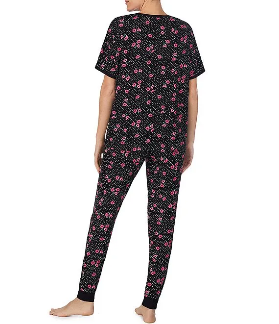 Knit Floral Dot Print Short Sleeve Round Neck Top & Jogger Pajama Set
