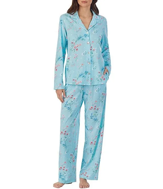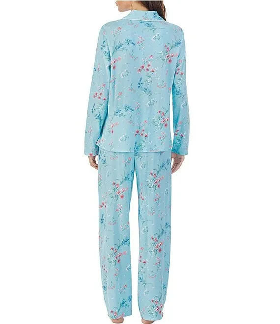 Floral Knit Long Sleeve Notch Collar Long Pant Pajama Set