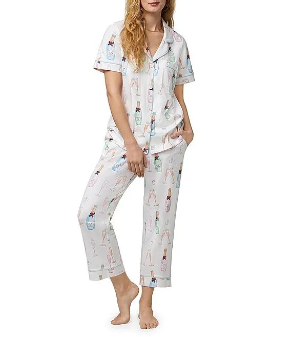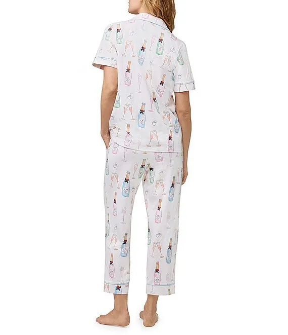 Champagne Wedding Print Short Sleeve Notch Collar Jersey Knit Cropped Pajama Set