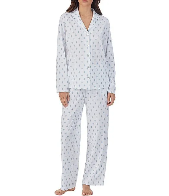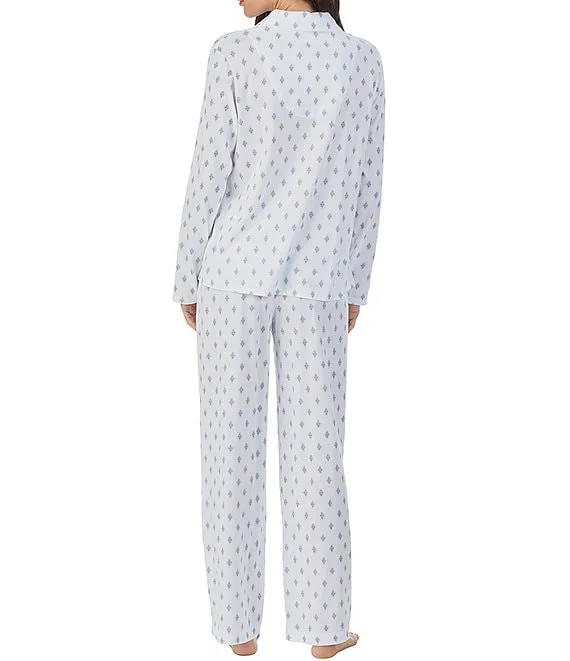 Knit Diamond Print Long Sleeve Notch Collar Long Pant Pajama Set