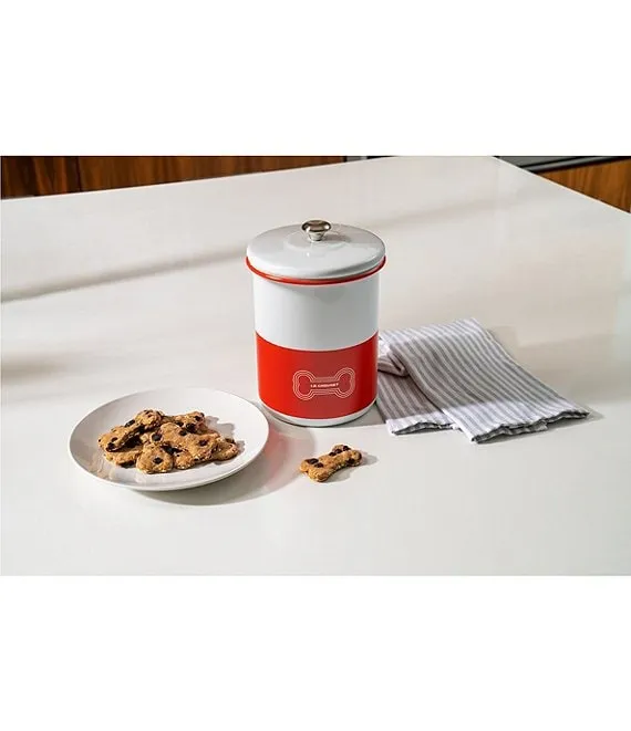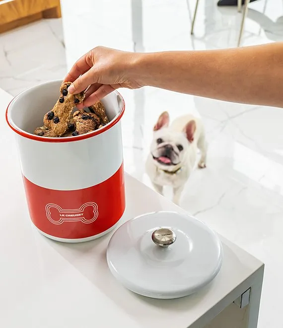 The Le Creuset Treat Jar is a stylish way to create happy meals for happy dogs. Crafted from human-grade carbon steel, the jar has a generous 4.25-quart capacity that is paw-fect for storing kibble and tasty treats. It’s finished with a colorful glaze and our iconic three rings in a fetching dog bone design and topped with a signature stainless steel knob that coordinates with other Le Creuset cookware. As dependable as your best friend, the enamel coating is hygienic, easy to clean, and resistant to chips, stains, scratches, and rust. Bone appétit! Crafted from premium carbon steel to keep food hot or cold.