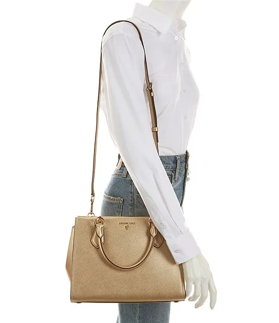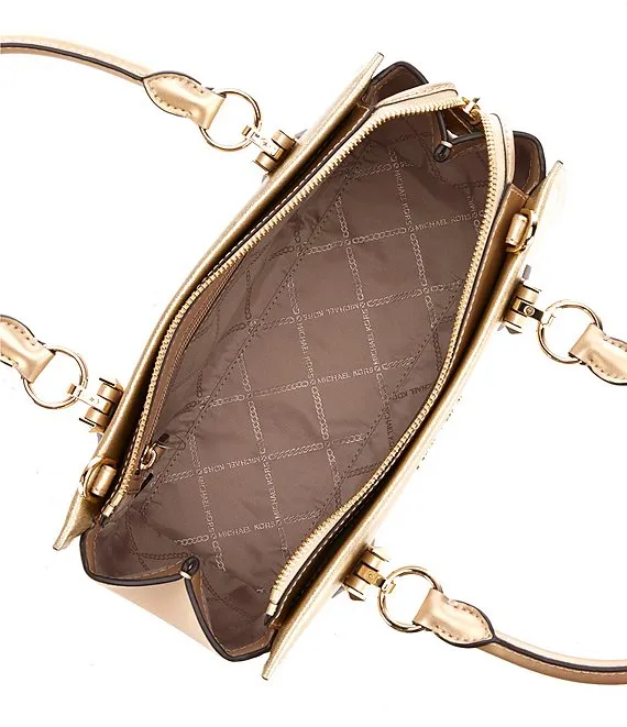 From Michael Kors, the Marilyn Metallic Gold Medium Satchel Bag features: