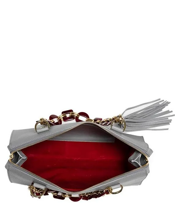 From Kelly-Tooke, the Medium Grey Soho Berry & Gold Chain Satchel Bag features: