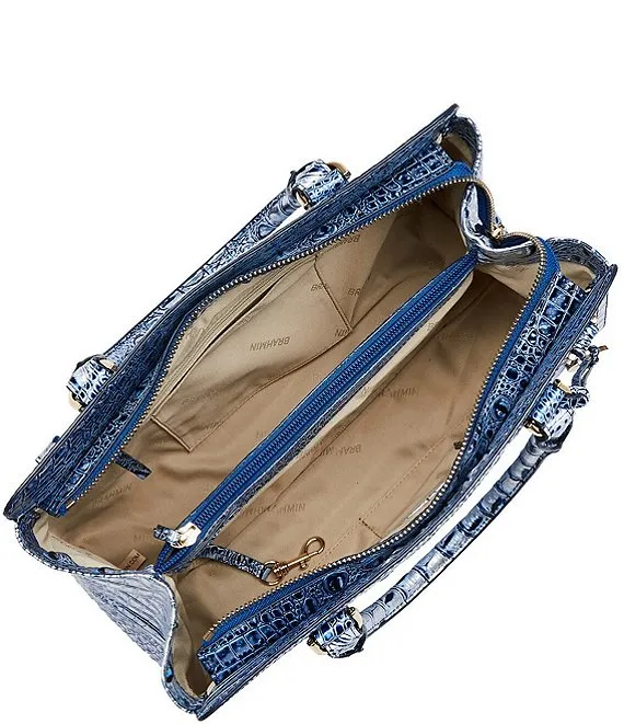 From the Melbourne Collection by BRAHMIN, the Coastal Blue Small Finley Carryall Satchel Bag features: