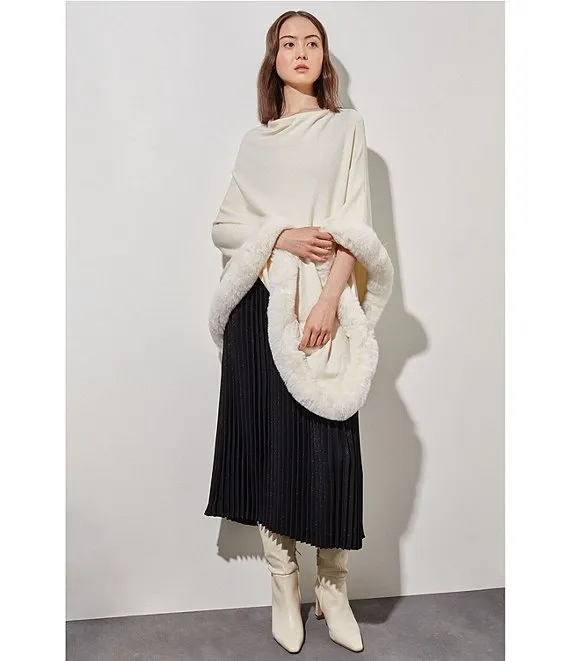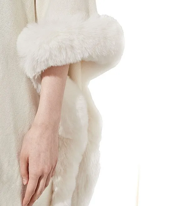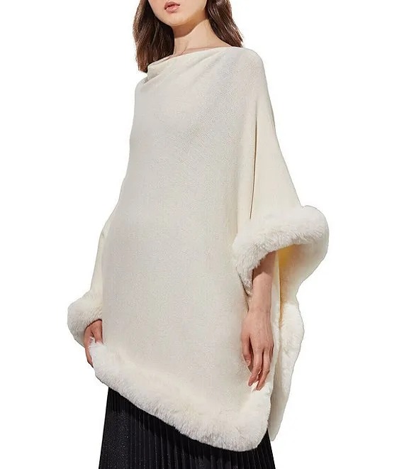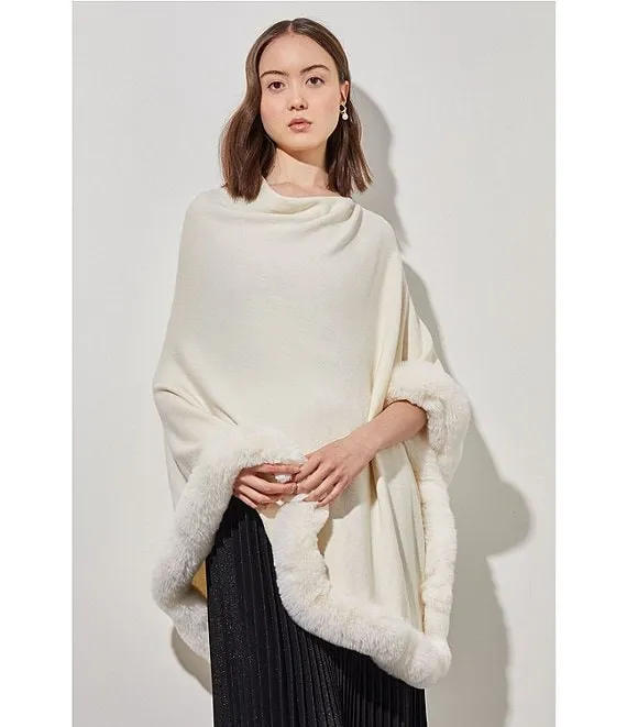 Knit Cowl Neck 3/4 Sleeve Faux Fur Trim Poncho