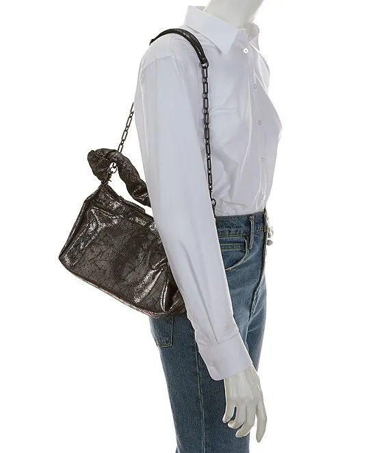 From Antonio Melani, the Metallic Leather Gunmetal Hardware Crescent Shoulder Bag features: