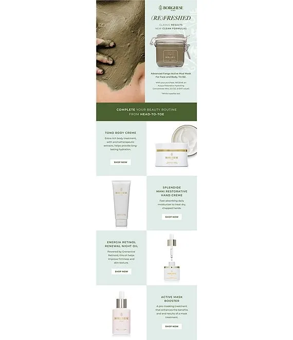 Our iconic glass jar is back! Mineral-enriched and free of Parabens, SLS and SLES, and Phthalates, this traditional Tuscan spa treatment clarifies, purifies, and enhances skin elasticity without overdrying. Leave on for 2-5 minutes and remove before mask dries.