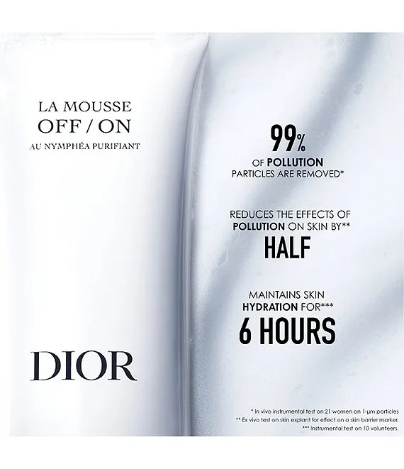 OFF: the foaming face cleanser combines anti-pollution action with purifying properties. It also protects against the harmful effects of pollution particles. Infused with water lily from the Dior gardens, which is known for its purifying and depolluting properties, OFF/ON Foaming Cleanser eliminates urban pollution residue. Formulated by Dior experts, it eliminates pollution particles, removes makeup and optimally cleanses the skin. Pores seem perfectly cleansed, skin texture appears refined, the complexion even.