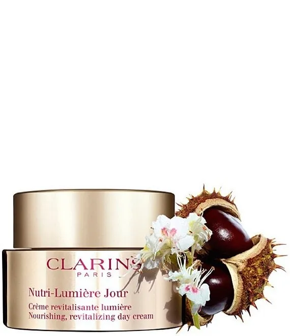 Nutrient-rich, anti-aging day moisturizer deeply nourishes mature skin that is dull, fragile, and severely dry—restoring its radiance and vitality. The melting, oil-infused, non-greasy texture leaves skin smooth, comfortable and intensely hydrated. Clarins nutrition innovation the clarins laboratories have discovered the remarkable revitalizing and anti-aging actions of the horse chestnut plant—known for its longevity, strength, resistance, and rebirth each spring—and have chosen it to power our nutri-lumière collection. Two potent parts of the plant—organic flower extract and the active fruit molecule, escin—help revive skin for a complexion that is smooth, luminous and healthy-looking. Clarins scientific discovery the skin’s micro-nutrient network is responsible for transporting nutrients and maintaining the skin's youthful appearance. With age, the micro-nutrient network becomes sluggish—resulting in dullness, deep-wrinkles, dark spots and dry, fragile skin. + clarins natural plant-based expertise the nutri-lumière collection is formulated with 10 organic ingredients.  . New organic wakame seaweed extract and plant squalane promotes supple, youthful-looking skin that appears strong and healthy-looking. . A blend of deeply hydrating organic harungana, organic oat sugars, organic desert date, and organic leaf of life extracts visibly lifts and smooths slackened skin and target dark spots. . Shea butter nourishes, comforts, and softens. . Clarins’ anti-pollution complex protects the skin from harmful indoor and outdoor pollutants. Pair with nutri-lumière night cream to boost results and reactivate the skin's luminosity.