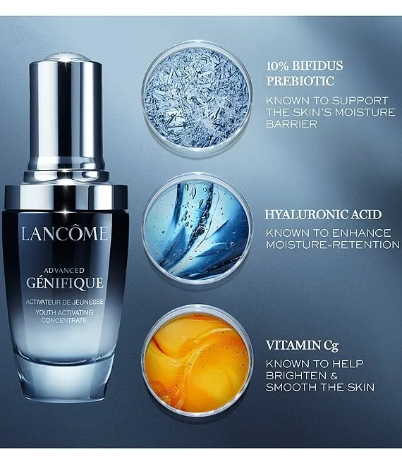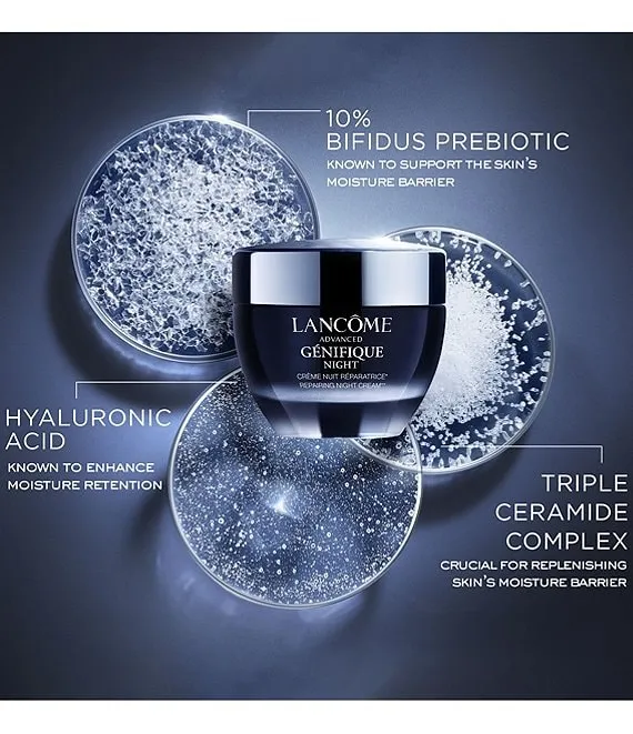 Advanced Génifique Face Serum delivers instant hydration. The Night Cream repairs the skins moisture barrier overnight. And the eye cream targets eye concerns for a brighter, smoother look." HOW TO APPLY:
