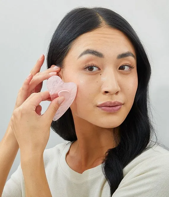 1. Apply skincare.2. Use a long, straight edge on the forehead and neck.3. Use curves on eyebrows, cheekbones, and jaw.4. Use a long, curved edge on cheeks.5. Use a big edge on crow's feet and under eyes.6. Use small point between eyebrows, temples, and nasal area.7. Rinse with soap and water.