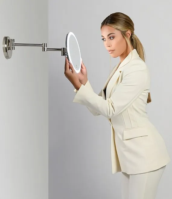 The Rechargeable Round Mirror mimics true daylight with a Color Rendering Index (CRI) of 98 out of 100, delivering the most detailed makeup application of any mirror available today. The long-lasting rechargeable battery provides up to six hours of power following a single charge. The mirror can be easily mounted without needing nearby electricity due to its long-lasting rechargeable battery. Quickly detach the mirror from its magnetic, retractable arm for handholding, or pair it with an optional suction cup and take it with you. The retractable arm has four positioning points for maximum adjustability. Engineered with convenience and simplicity, the distortion-free mirror ranges from 100 to 800 lux with simple one-touch adjustable lighting. 20% brighter than standard makeup mirrors, you'll see every detail eliminating makeup mistakes. Easily tilt and rotate the mirror 360 degrees for exact positioning. Unlike traditional makeup mirrors, our long-lasting LEDs are rated for over 50,000 hours.