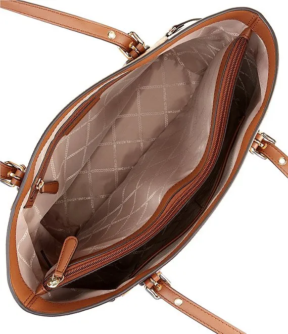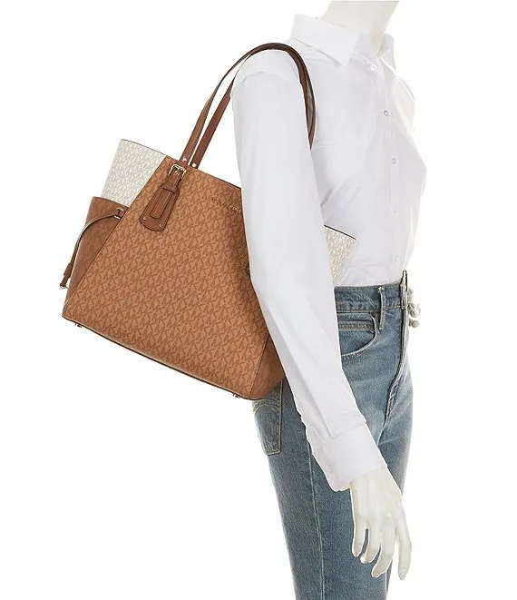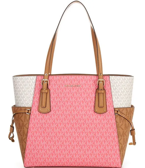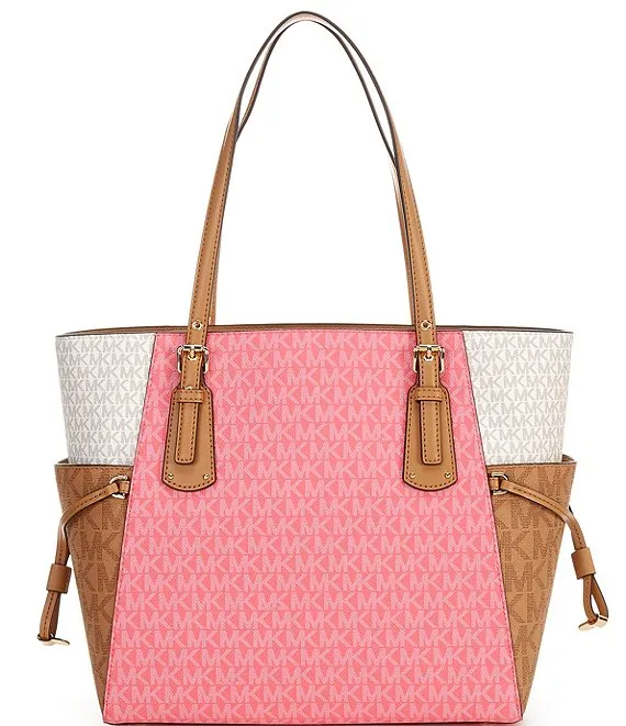 From Michael Kors, the East West Signature Logo Tricolor Color Block Voyager Tote Bag features: