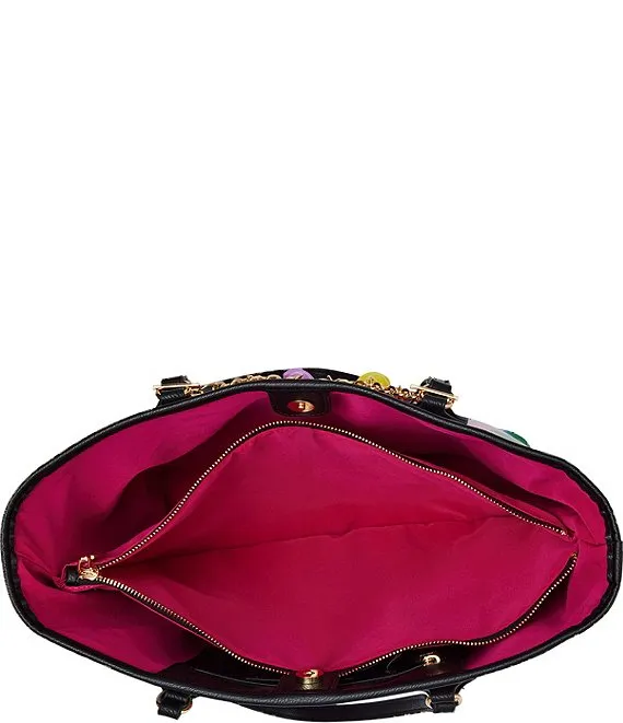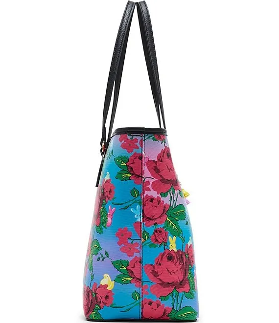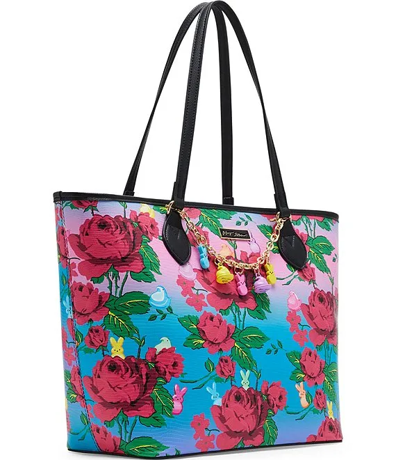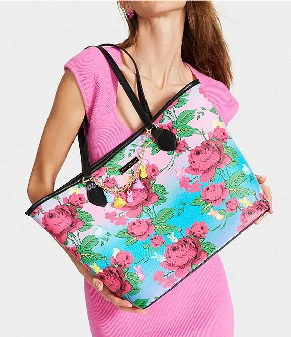 From Betsey Johnson, the Removable Peeps Charm Bracelet Floral Tote Bag features: