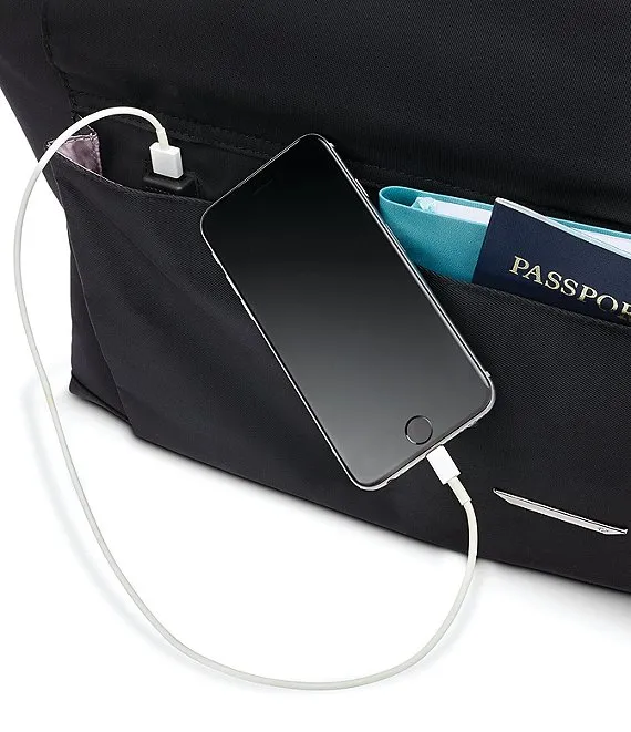 - Front flap pocket includes USB charging port