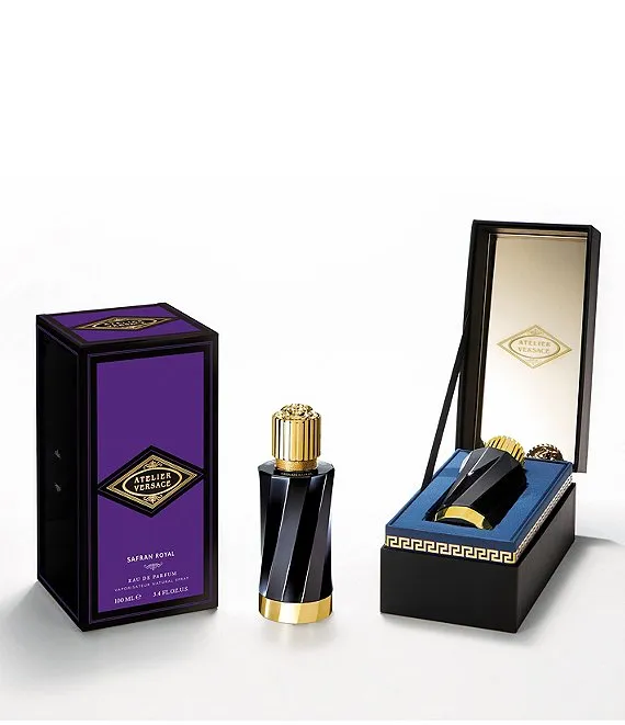 Safran Royal is the unique interpretation of the rare and precious character of the most expensive spice in the world—saffron. The spicy scent is refreshed with bittersweet Moroccan wormwood, leading to an enriching mix of leather and amber olfactory notes. Indian cypriol, Indonesian patchouli and Spanish cistus add a unique touch to the fragrance.The Atelier Versace fragrance line consists of twelve unique eau de parfum scents. The sculptural glass bottle is engraved with the name of the fragrance, and the packaging features the Atelier Versace logo in the interior mirror.
