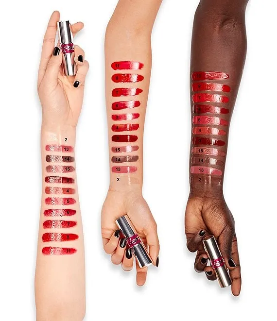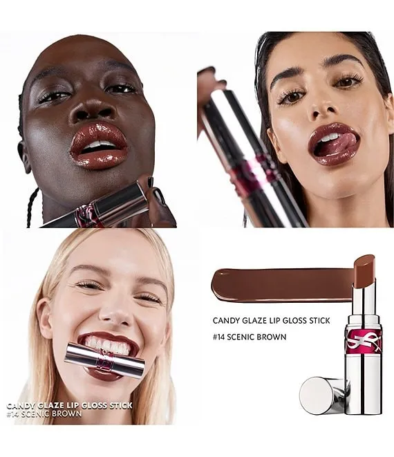Treat your lips with high color, glazing shine, and balmy care. Candy Glaze Lip Gloss Stick's supercharged formula infuses hyaluronic acid, vitamin E and cold-pressed mango oils into a high-shine gloss that locks in moisture for 12 hours. The formula is also infused with Moroccan pomegranate extract sourced from the YSL Beauty Ourika Community Gardens and mango oil. Candy Glaze smoothly melts onto lips for indulgent, comfortable wear. The signature Yves Saint Laurent packaging is a couture object of desire and ensures freshness with each click for a deliciously sweet and glossy shine.